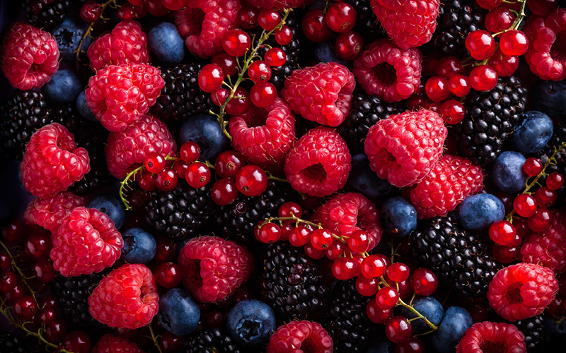 Brombeere, Erdbeere, Gojibeere, Heidelbeere, Himbeere, Ribisel rot & schwarz, Stachelbeere, Weintrauben,